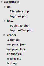 },Nach einem composer update steht das Framework zur Verfügung. Folgend habe ich im Verzeichnis tests/ eine bootstrap.php Datei erstellt, welche den Composer-Autoloader ausführt und Aspect-Mock lädt.