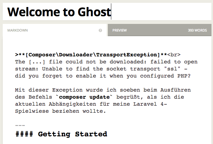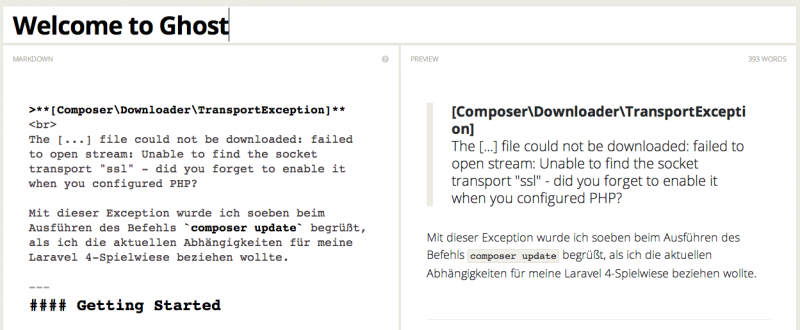 Wenn die Installation erst ein mal überstanden ist, ist die Anwendung und Nutzung dann umso leichter. Sozusagen denkbar einfach. Ghost setzt auf Markdown, einer einfachen Beschreibungssprache. Das ist zwar nichts Neues, jedoch ist die Umsetzung meiner Meinung nach bestens gelungen. Eine überaus schnelle Live-Vorschau macht das Schreiben und Bloggen zum Erlebnis.