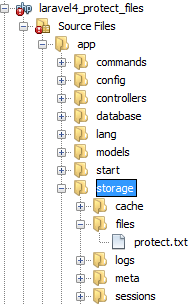 Im app-Verzeichnis des Laravel-Ordners befindet sich ein Ordner namens storage. Dies ist der von Laravel für dieses Szenario vorgesehene Ablage-Ordner der zum Download angebotenen Dateien. In diesem Verzeichnis habe ich für das Beispiel einen Ordner mit dem Namen files angelegt. Darin habe ich die Datei protect.txt abgelegt. Der Verzeichnisbaum sieht nun wie folgend abgebildet aus.