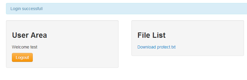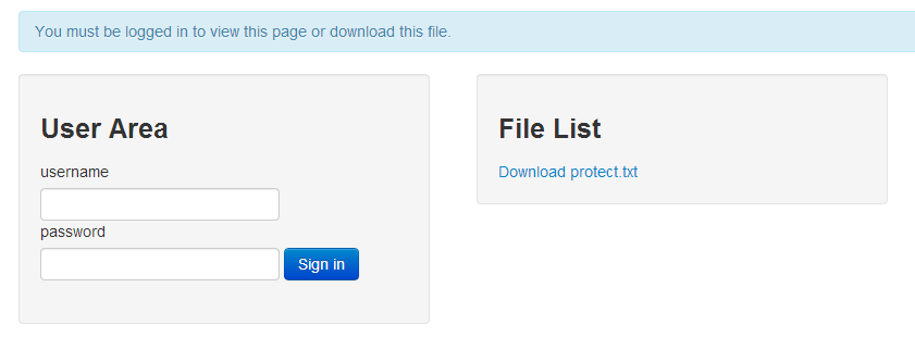 Ich verwende für dieses Beispiel ein simples View mit einem Login-Formular und einem Download-Link zur Datei im Storage-Verzeichnis. Außerdem erhält das View noch eine kleine Info-Box am oberen Rand in welcher diverse Meldungen ausgegeben werden.