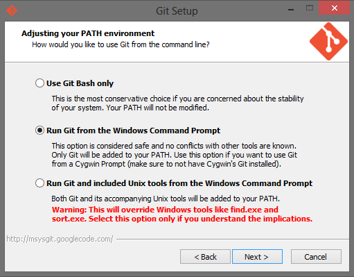 Mit der Installation von Composer ist ein wichtiger Schritt geschafft. Doch bevor alle Abhängigkeiten von laravel 4 bezogen werden können, muss Git lokal installiert werden, da beim Einbinden der Abhängigkeiten diverse Git-Repositorys geklont werden. Nach dem Download von Git muss während der Installation der Punkt “Run Git from the Windows Command prompt” ausgewählt werden.