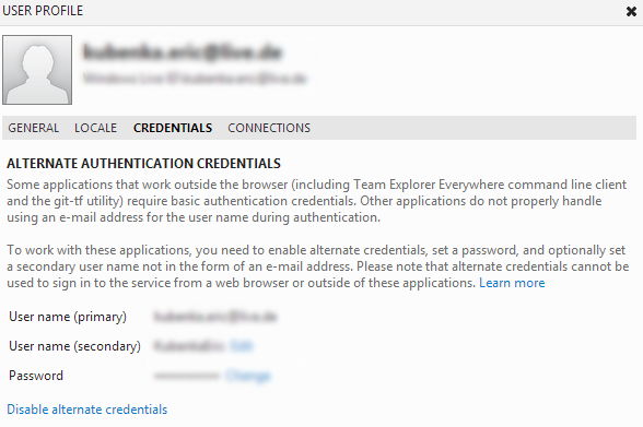 Um das Git-Repository abrufen zu können müssen online noch die Credentials auf dem TFS aktiviert werden. Dazu einfach innerhalb der Online-TFS-Oberfläche das eigene Profil öffnen.Dort kann dann im Bereich “Credentials” die Aktivierung und Änderung der Nutzerdaten vorgenommen werden.