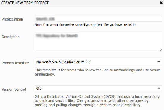 Als erstes habe ich innerhalb meiner ProjectCollection mittels der neuen Schaltfläche “New Team Project + Git” ein neues Projekt erstellt. Dabei sollte als Versionskontrolle “Git” ausgewählt werden. Selbstverständlich benötigt das Projekt noch einen Namen.
