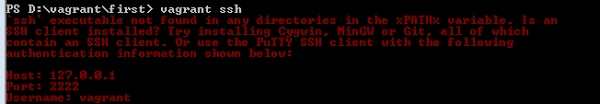 Nun kann mittels des Befehls vagrant ssh direkt eine Verbindung zur einfachen Administration aufgebaut werden. Wenn ihr folgende Fehlermeldung seht, so haltet Euch an die angegeben Anweisungen. Ich persönlich nutze das Cygwin-Terminal, oder die Git-Bash, weshalb ich keine Probleme mit SSH hatte.